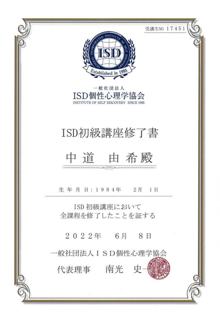 ISD個性心理学協会初級講座修了証