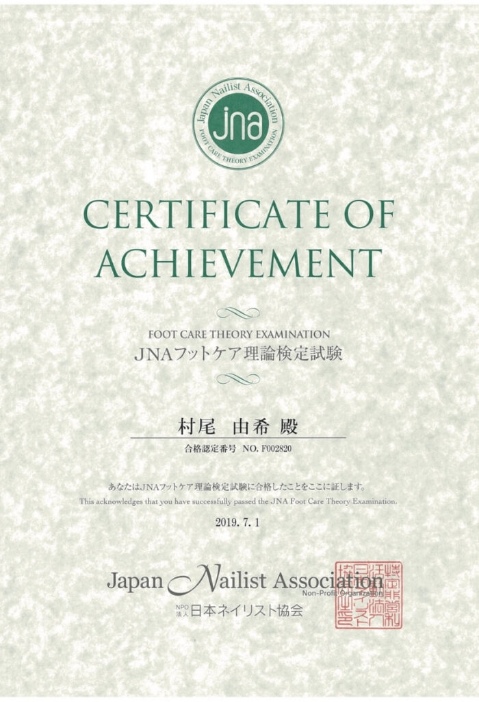 JNAフットケア理論検定試験合格証