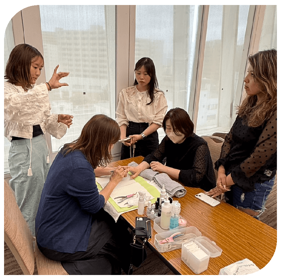 well’s yuki では、自爪育成・噛み爪育成・深爪育成・に対応したケア育成、深爪スカルプ育成、ジェル育成といった専門技術を基礎から指導し、プロのネイリストを育成する講座を提供しています。